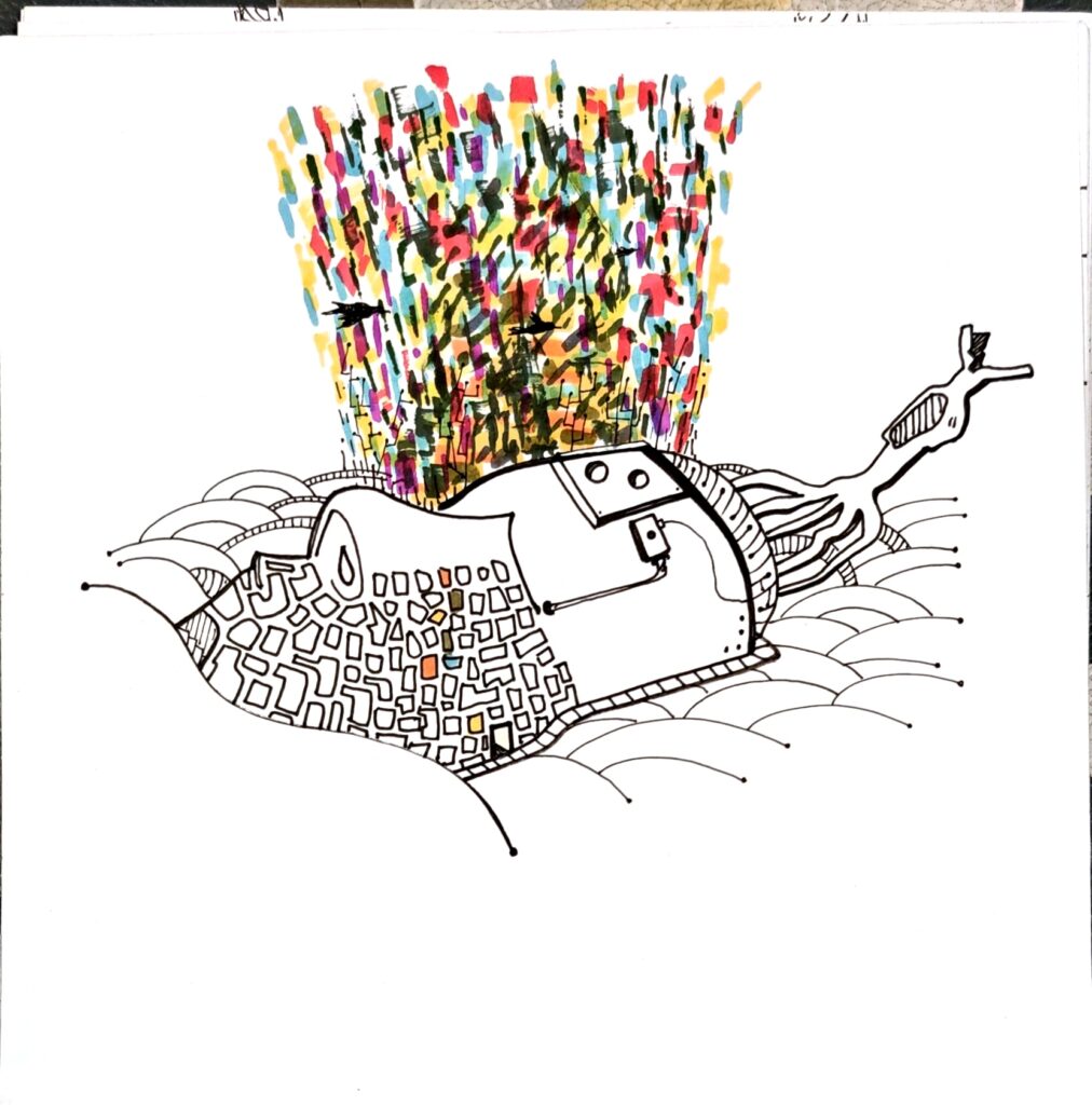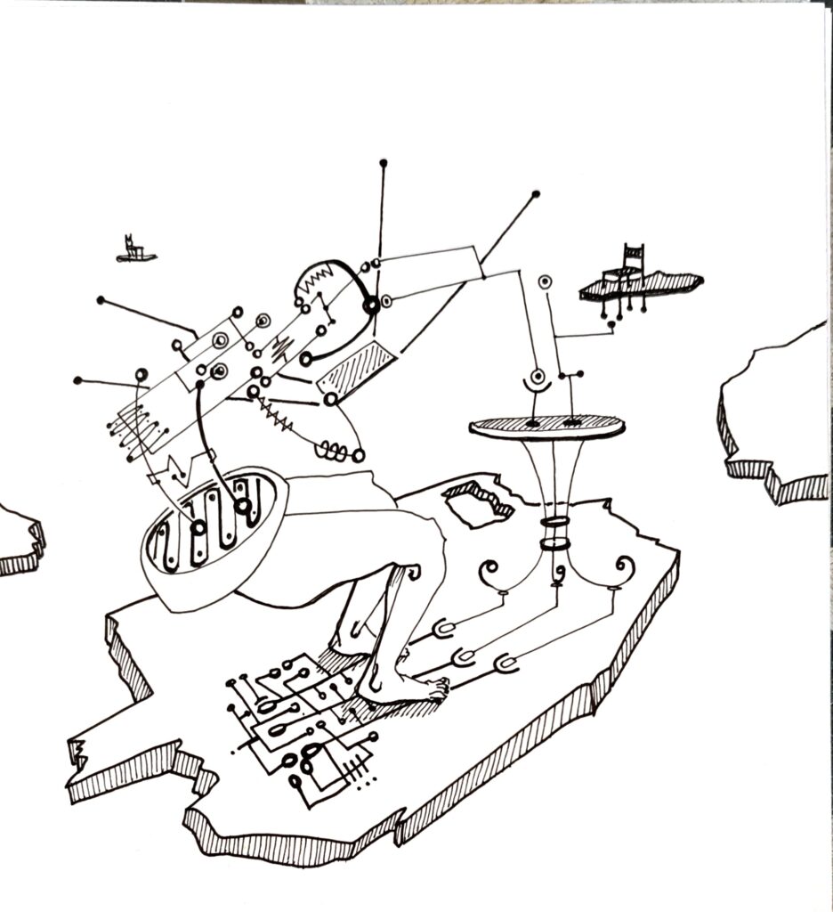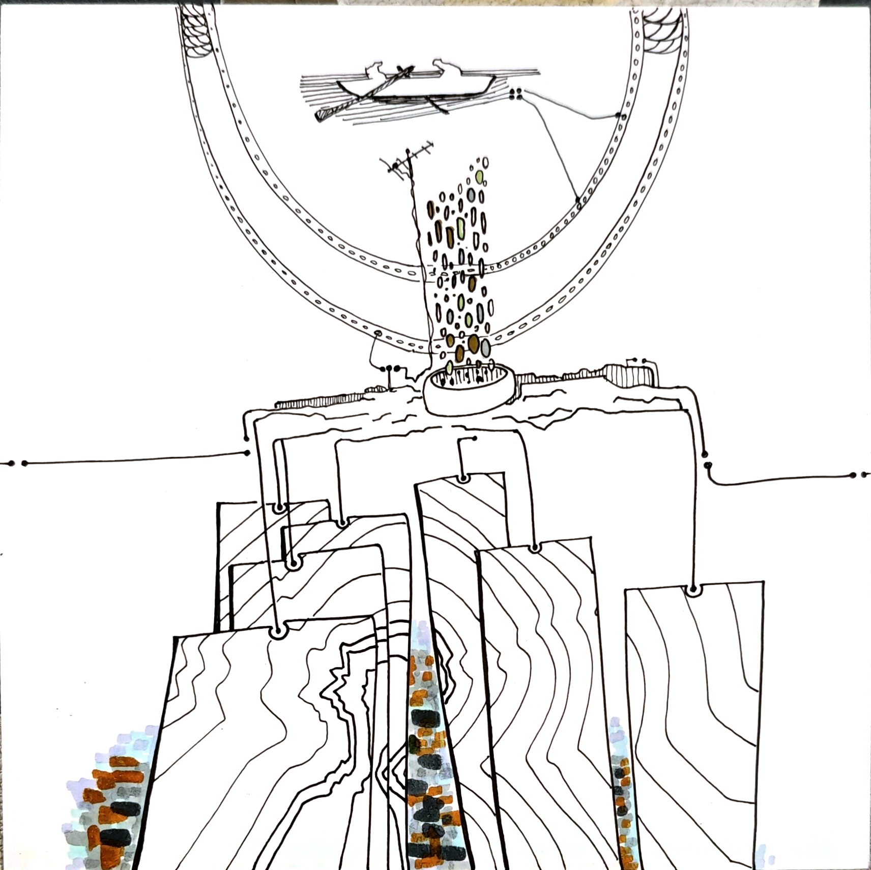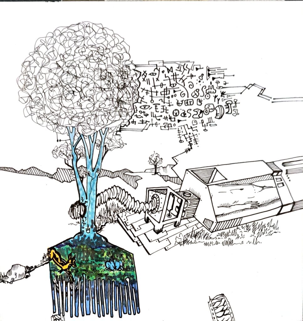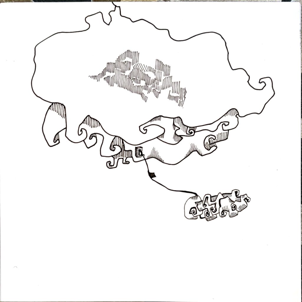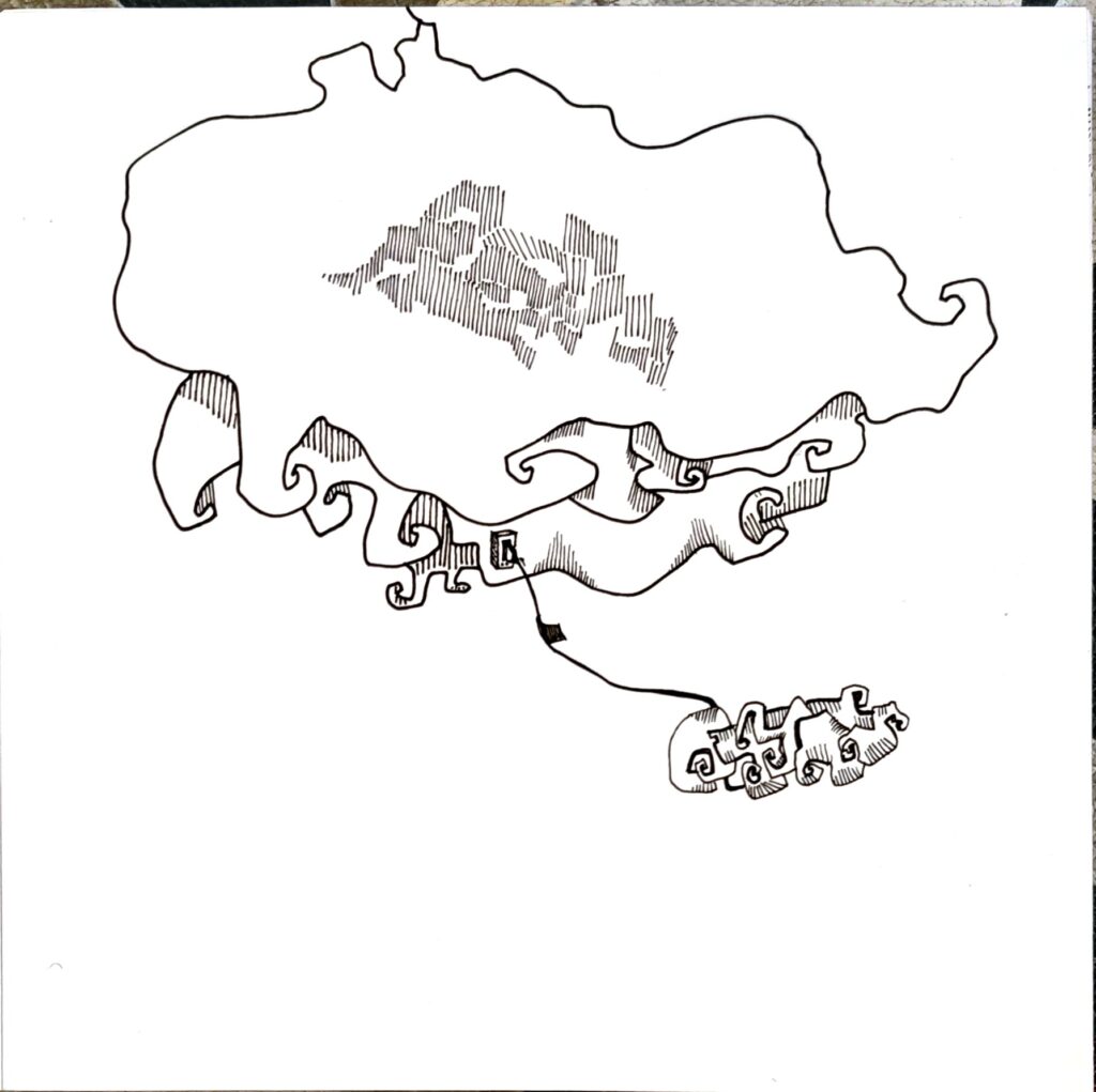 TUNAMPA no es un lugar fijo. Es una deriva. Un estado. Un contorno imaginario donde lo real y lo onírico se entrelazan sin pedir permiso.Las formas se dibujan como visiones, como fragmentos de una memoria colectiva desarmada por el tiempo.Hay montañas atravesadas por pasarelas imposibles, constelaciones que florecen en tallos, árboles que sostienen el abismo, figuras humanas de ensueños, recuerdos, y futuros posibles. Este sitio —dibujado en líneas que rozan lo absurdo y lo sagrado— propone una arquitectura del desconcierto. Una invitación a habitar el silencio, a ingresar en la “T” y la “U” como portales, como umbrales de una cartografía mental, suspendida en el espacio. TUNAMPA no se mira, se atraviesa. No se entiende, se percibe. Como quien escucha un sueño ajeno y lo reconoce como propio.Aquí, la lógica queda en pausa. Solo quedan las imágenes —ecos de lo que tal vez fuimos, o podríamos llegar a ser.