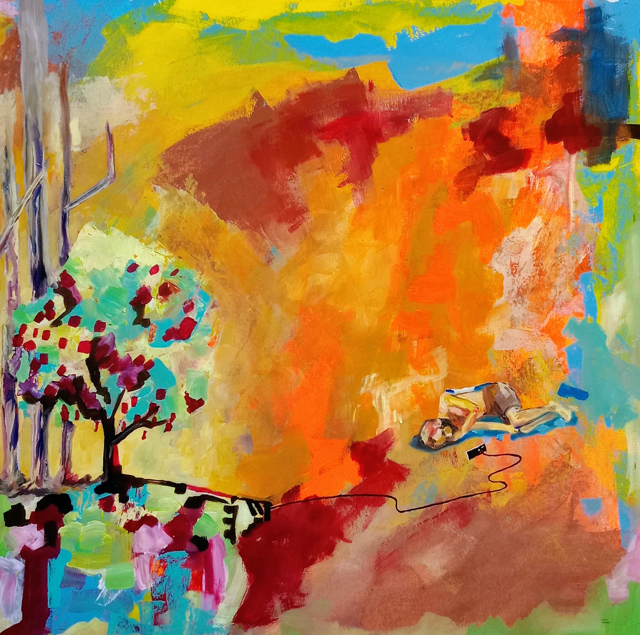 Abajo, en la llanura, tres cuerpos permanecen elevados por cables que se hunden en la arena. Son, quizás, los tres yo que fui, o que seré, sostenidos por una fuerza que no alcanzo a comprender.
